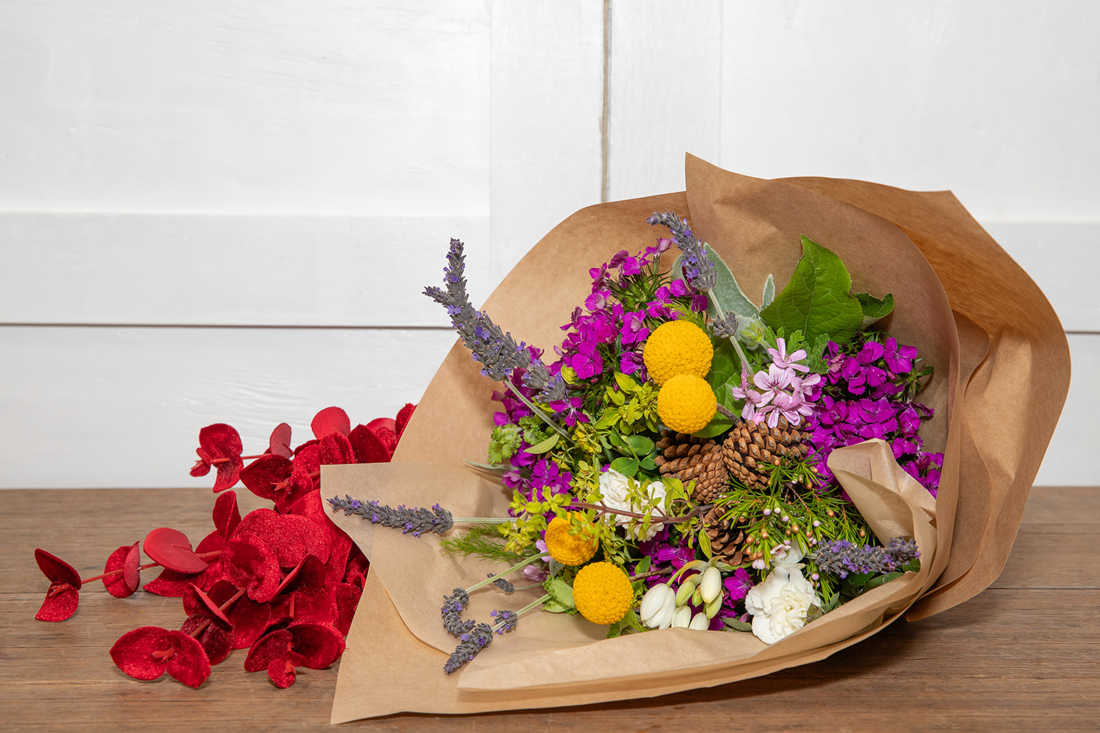 A sprinkle of fun, baubly, Billy button festiveness, our ever-popular seasonal herb and flower posies are gift wrapped for giving.