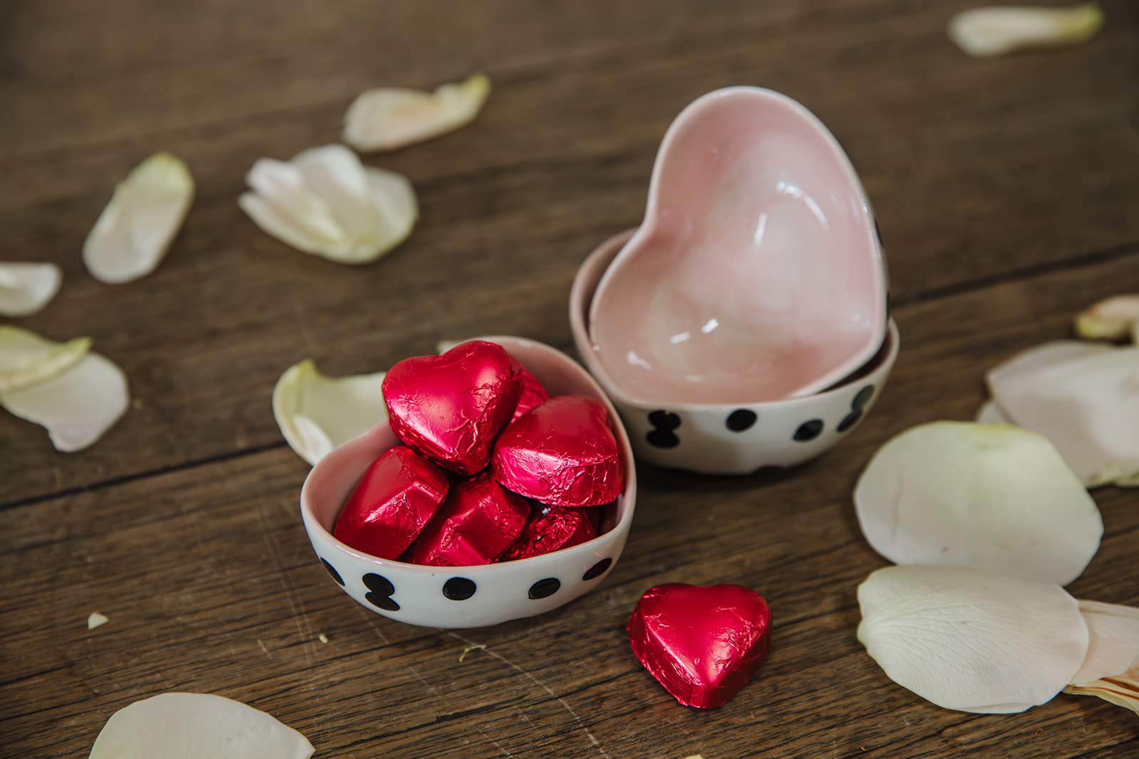 A gorgeous heart-shaped bowl filled with locally made strawberry cream chocolates.